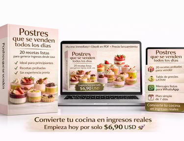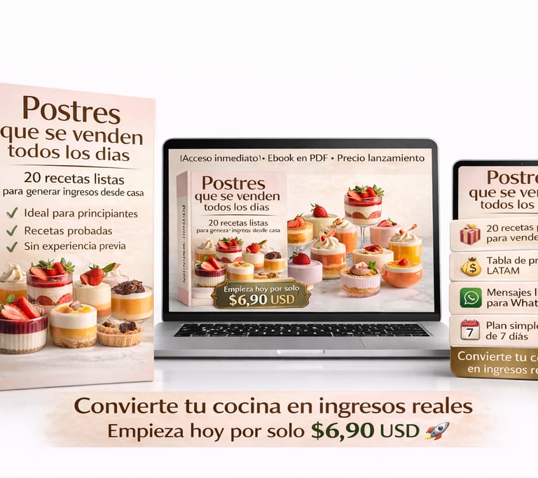 Con recetas probadas, precios sugeridos, mensajes listos y un plan simple para empezar a ganar dinero desde casa — incluso si nunca vendiste antes.